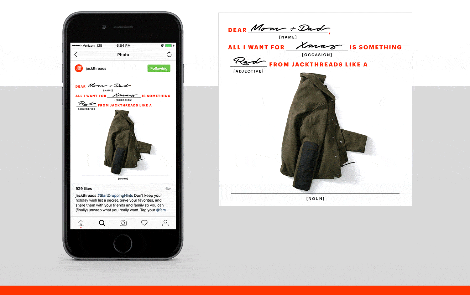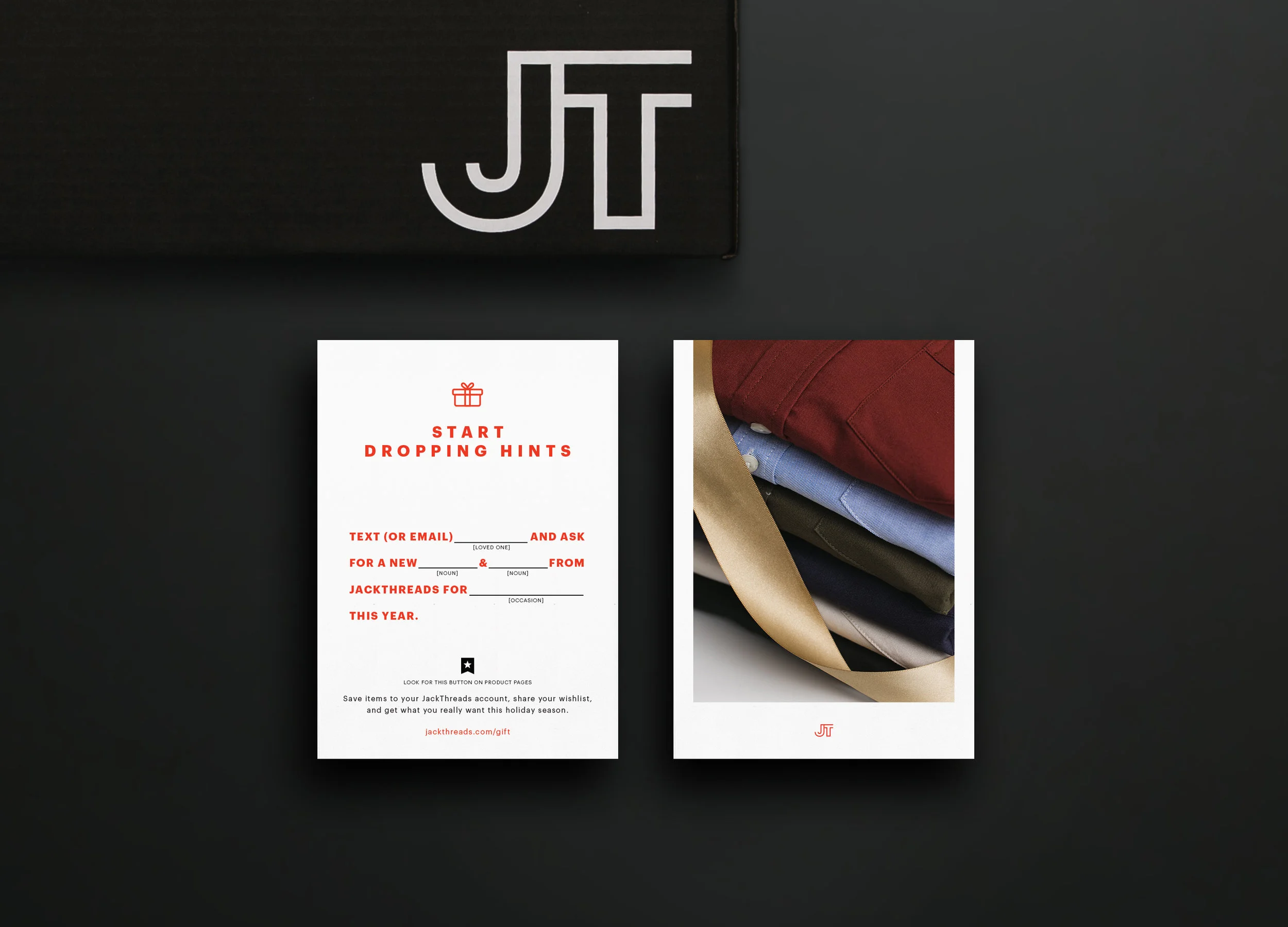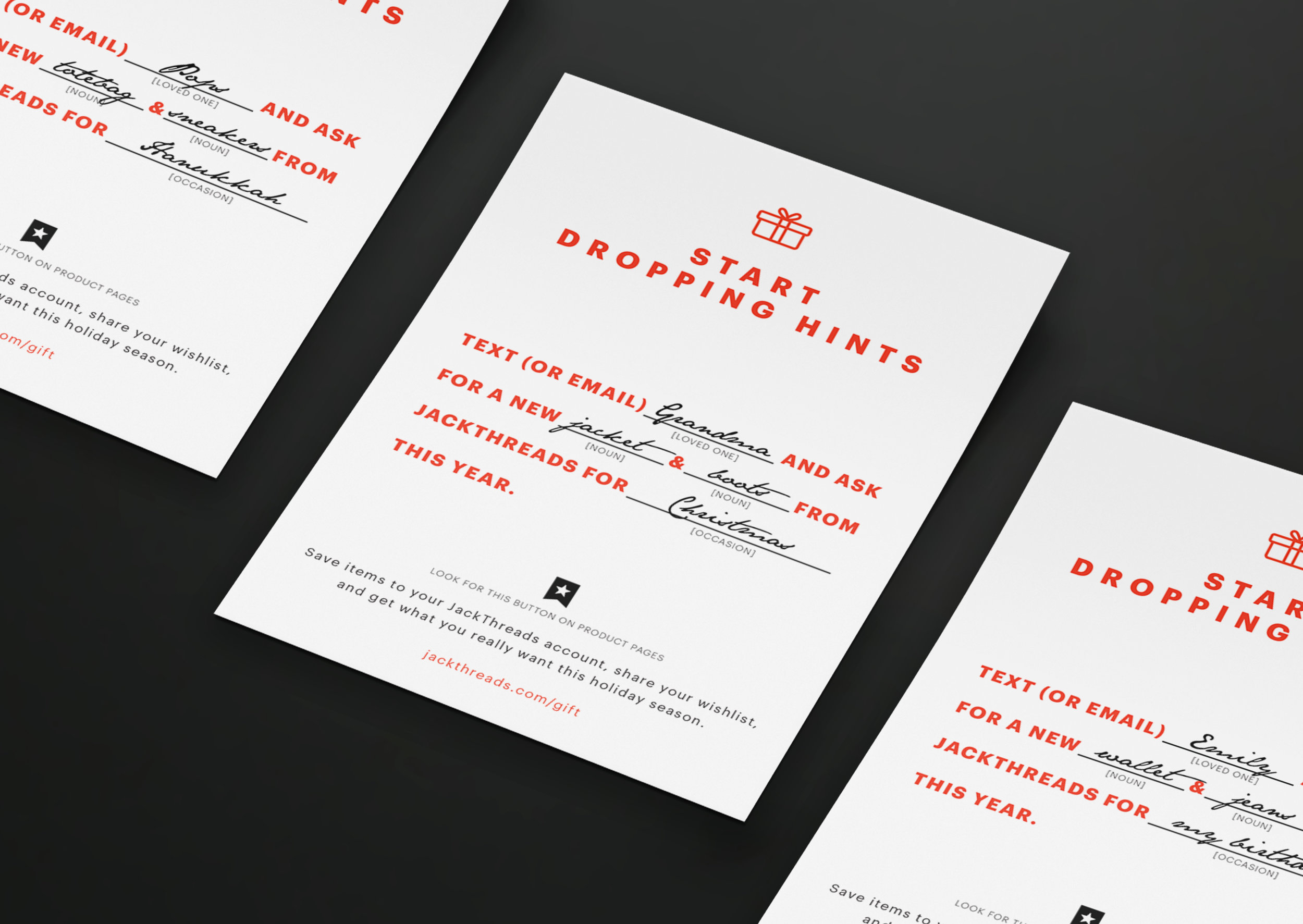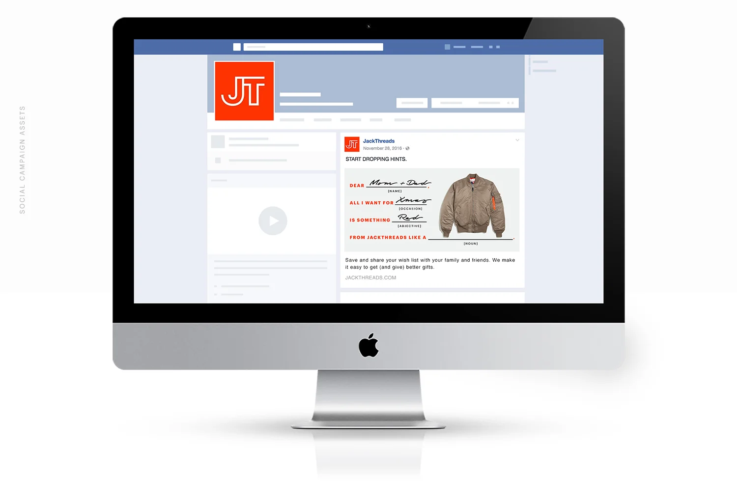 The objection of this campaign was to generate social engagement to help your loved ones gift you from JackThreads this year. I was responsible for conceptualizing and executing the physical collateral as well as the digital components that lived across email, social, banners and paid media.