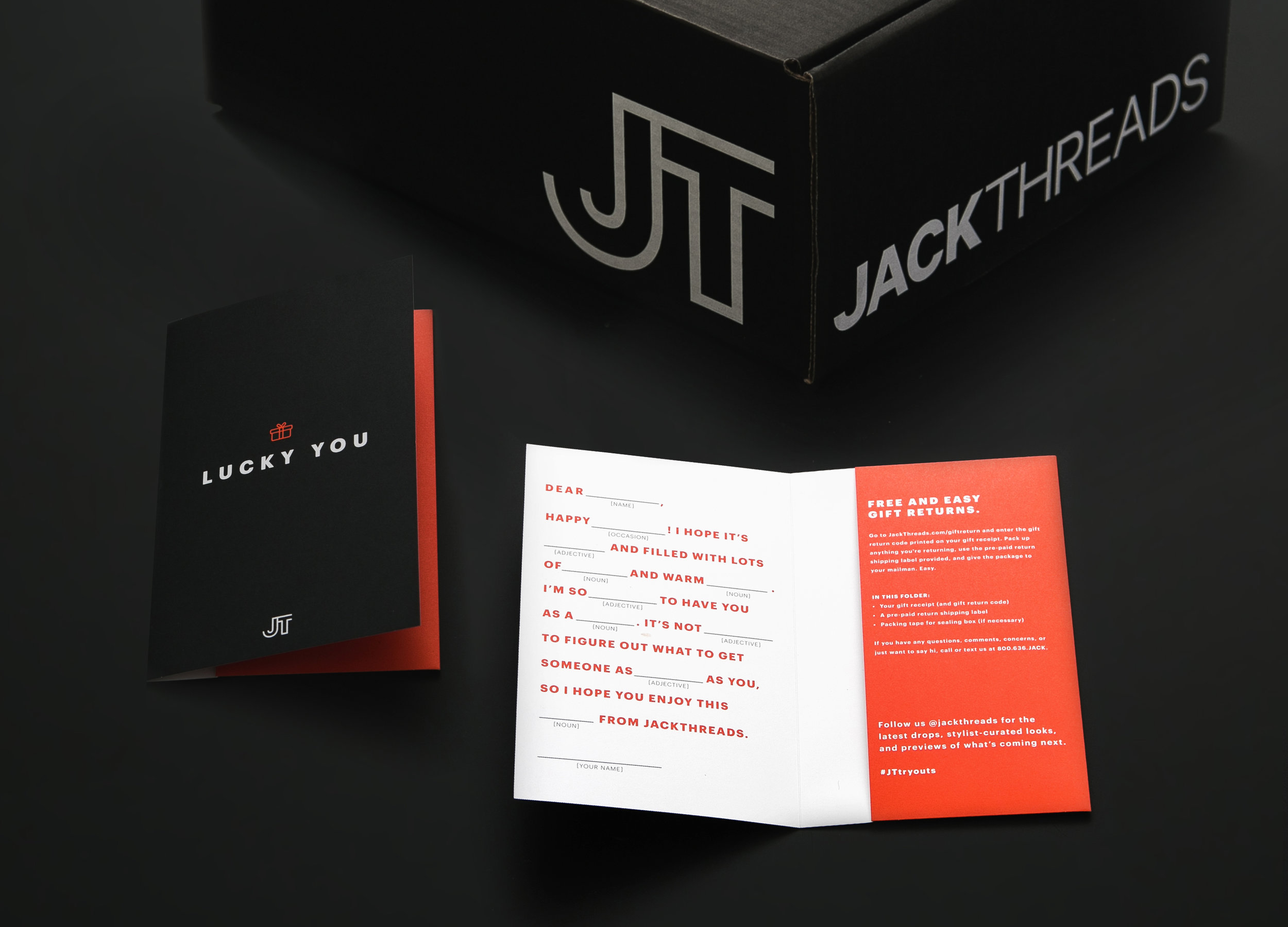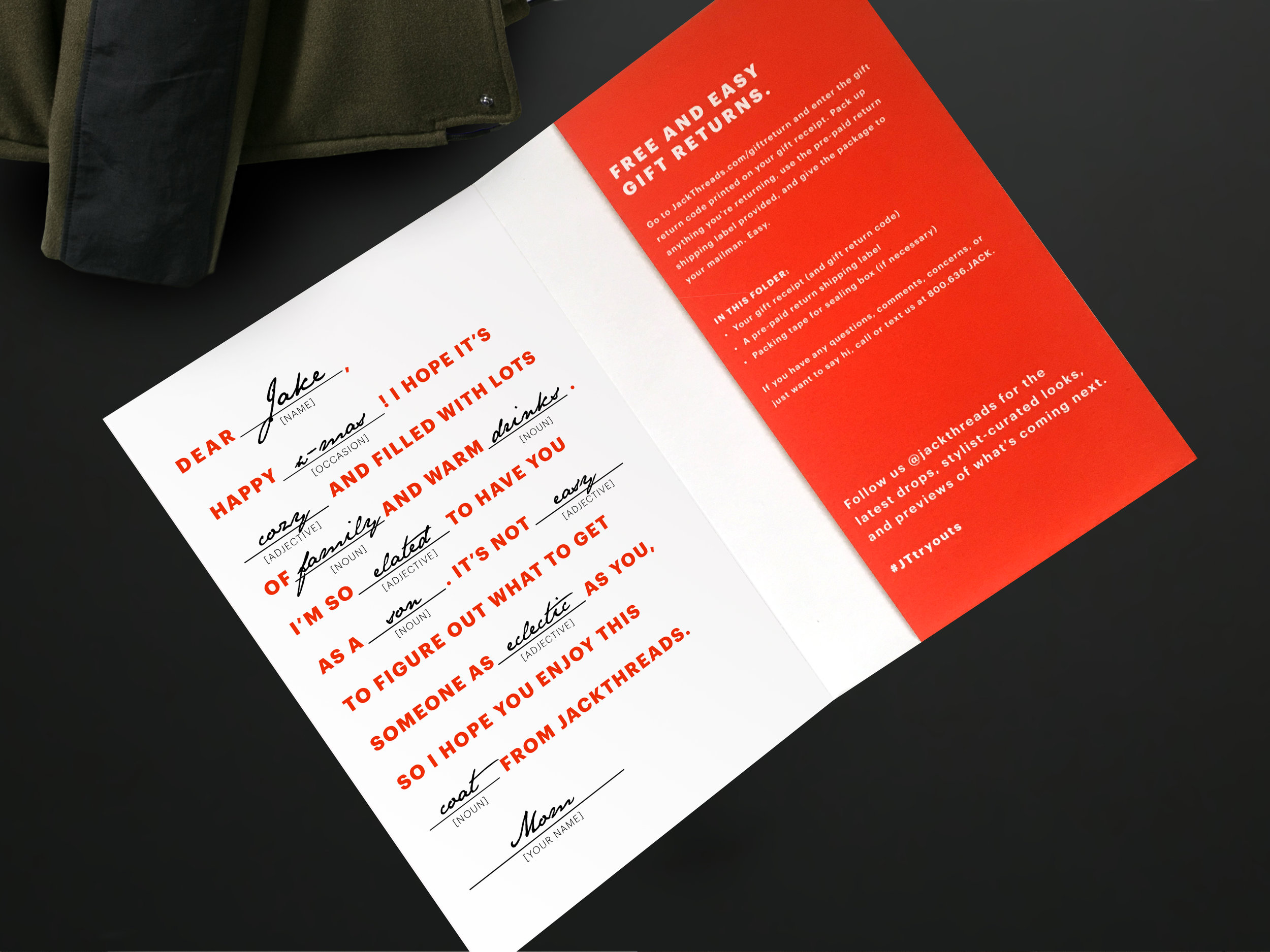 The first part of this marketing strategy included an interactive Inbox Teaser that was distributed in early November to help promote the site’s sharing functionality, by reminding our customers to save and share their favorite products with family and friends. Once a gift from JackThreads is purchased, it arrives with a similar Mad-Lib card to be filled out by the gifter and wrapped with the items for the giftee.